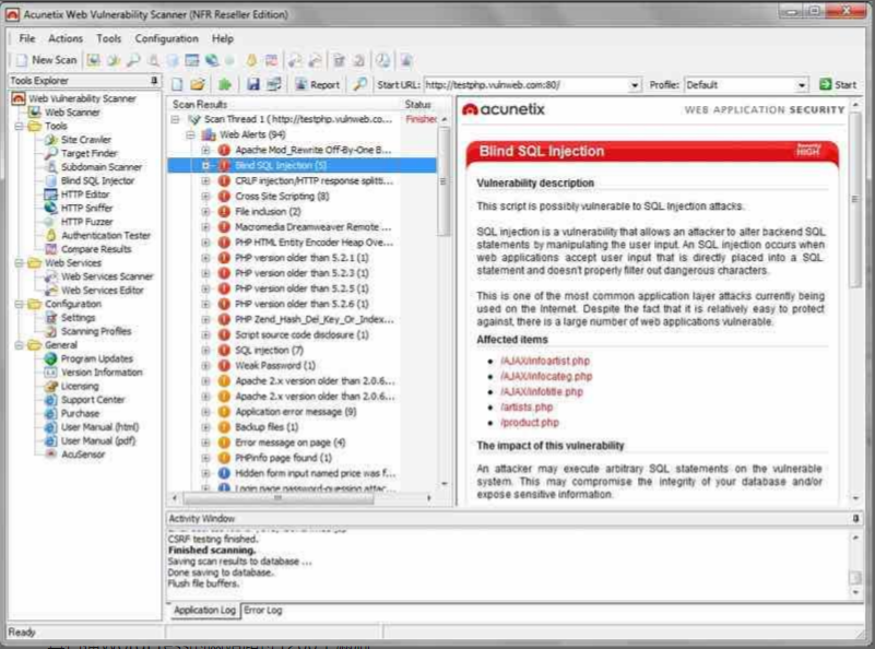 Acunetix是一個網路漏洞掃描器(WVS),可以掃描併發現網站上可能會導致致命性的缺陷。這個多線程工具會抓取一個網站,發現惡意的跨站腳本,SQL註入等漏洞。這個快速和易於使用的工具掃描WordPress的網站超過1200個漏洞。